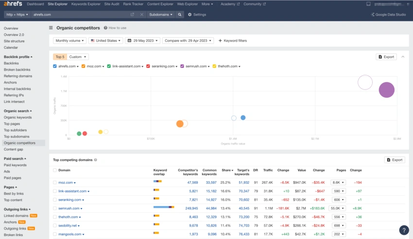 Ahrefs واحدة من أقوى أدوات السيو الاحترافية، وتُستخدم على نطاق واسع لتحليل المنافسين بدقة عالية. تركز بشكل أساسي على الروابط الخلفية والكلمات المفتاحية والمحتوى الأعلى أداءً.
